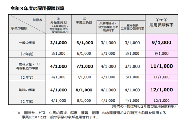 令和3年度の雇用保険率(下表)は、2年度から変更はありません。また、労災保険率についても、2年度から変更はありません。